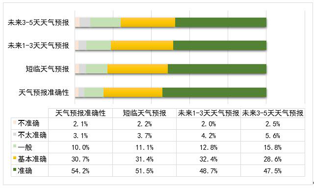 本次調查主要采取計算機輔助電話訪問(CATI)和面訪相結合的方式,共完成有效樣本5024個。調查指標體系主要包含公眾對氣象服務滿意度評價、公眾對天氣預報的準確性評價、公眾對氣象信息發布的及時性評價、公眾對氣象信息發布的便捷性評價、公眾對氣象災害預警服務滿意度評價、公眾對與氣象部門的互動性評價等。