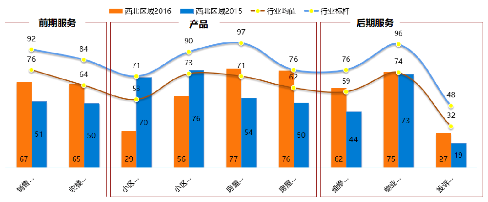從下方圖形中可看出:XXXX西北區域業主在銷售服務、收樓交房、房屋設計、房屋質量、維修服務、物業服務、投訴處理七大方面的滿意度評價相比去年有所提升,但業主對小區配套、小區環境和規劃兩個方面的滿意度評價相比去年有所下降,每個客戶體驗端口與行業均值*及行業標桿*均存在較大差距,所以后期仍需努力提升。