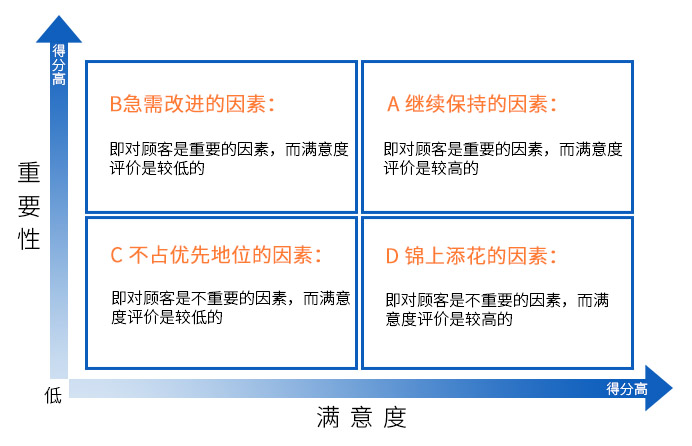 通過顧客對因素重要性的評價和滿意度評價,能夠區(qū)分出四種類型的因素,同時對企業(yè)或服務(wù)進行分析得出: