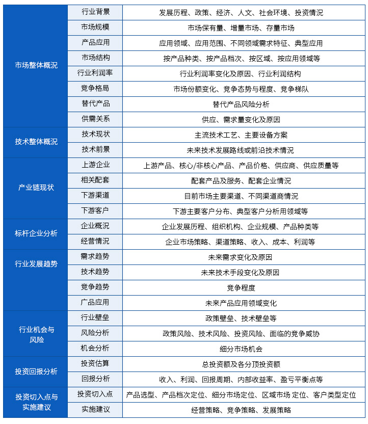 可行性研究的內(nèi)容包括行業(yè)宏觀研究、微觀運營分析、未來趨勢研究、機會風(fēng)險分析、投資可行建議和市場切入建議等六個方面。通過行業(yè)宏觀研究對市場整體情況進行宏觀梳理;通過微觀運營分析對產(chǎn)業(yè)鏈(上游、中游企業(yè)及配套方、下游)進行分析;通過未來趨勢研究判斷未來行業(yè)發(fā)展的趨勢;通過機會風(fēng)險分析判定行業(yè)機會、壁壘、風(fēng)險;投資可行分析從財務(wù)角度進行投資可行性、投資回報測算;市場切入建議是通過分析投資切入口,給出相關(guān)落地建議。
